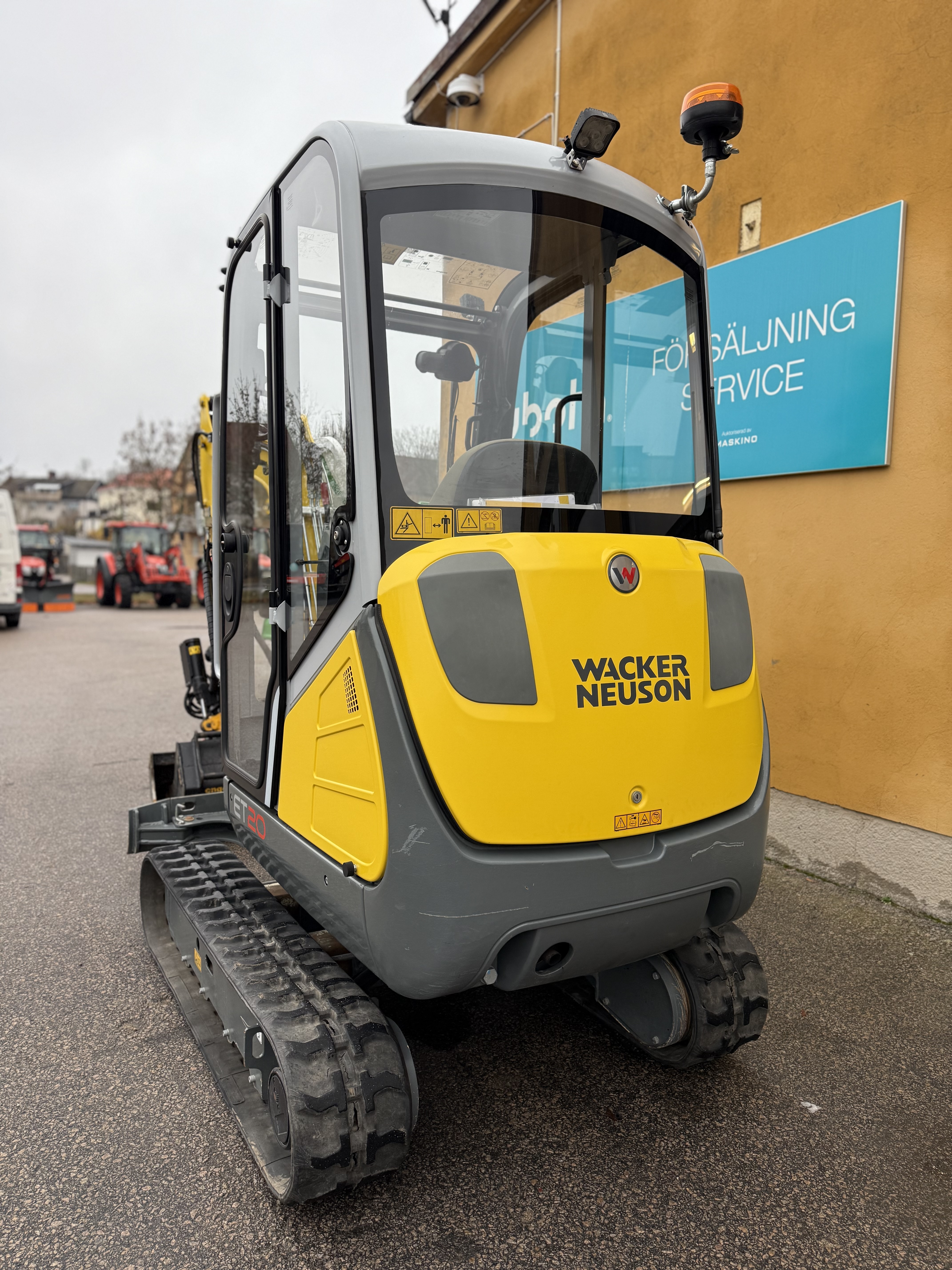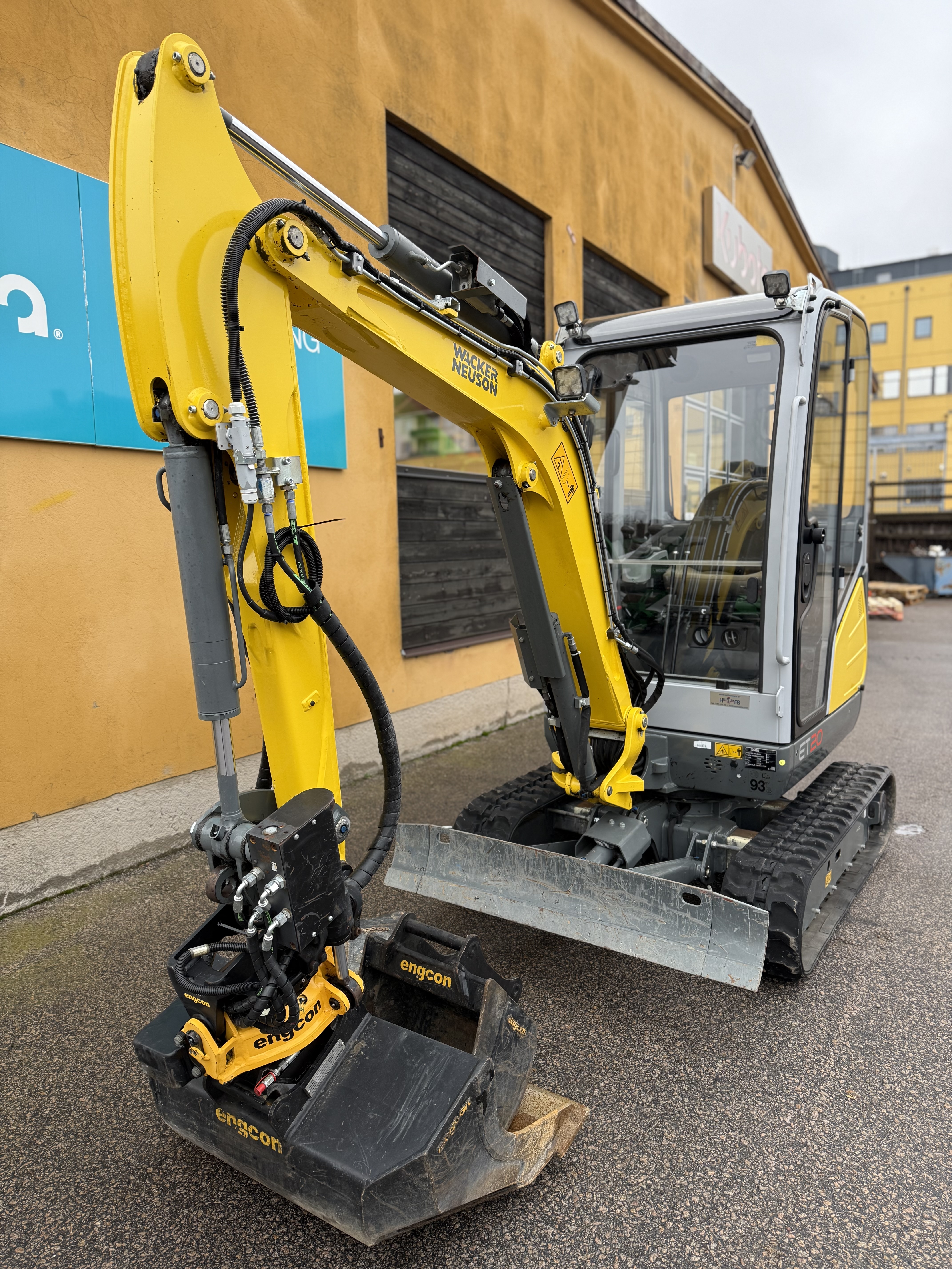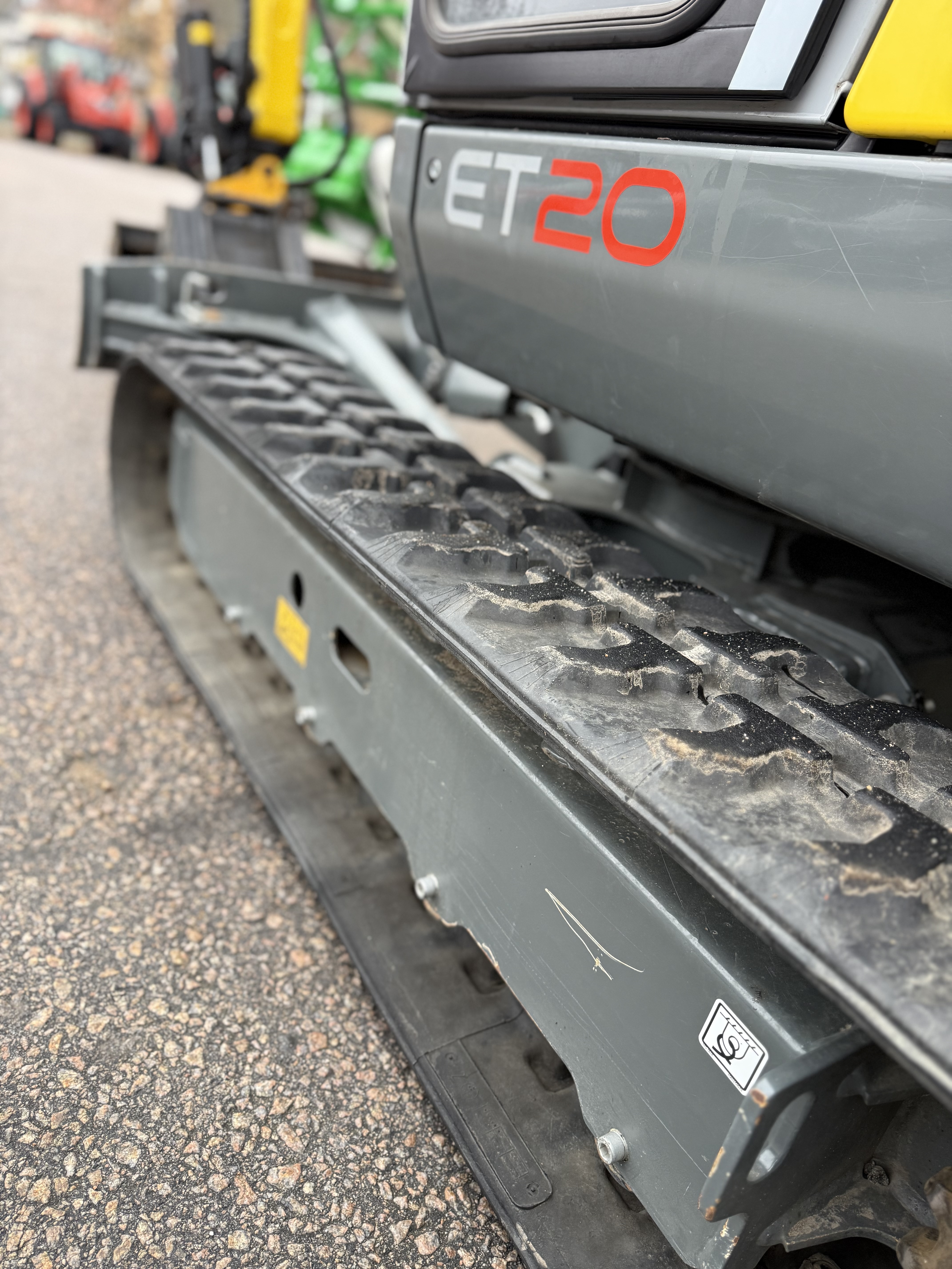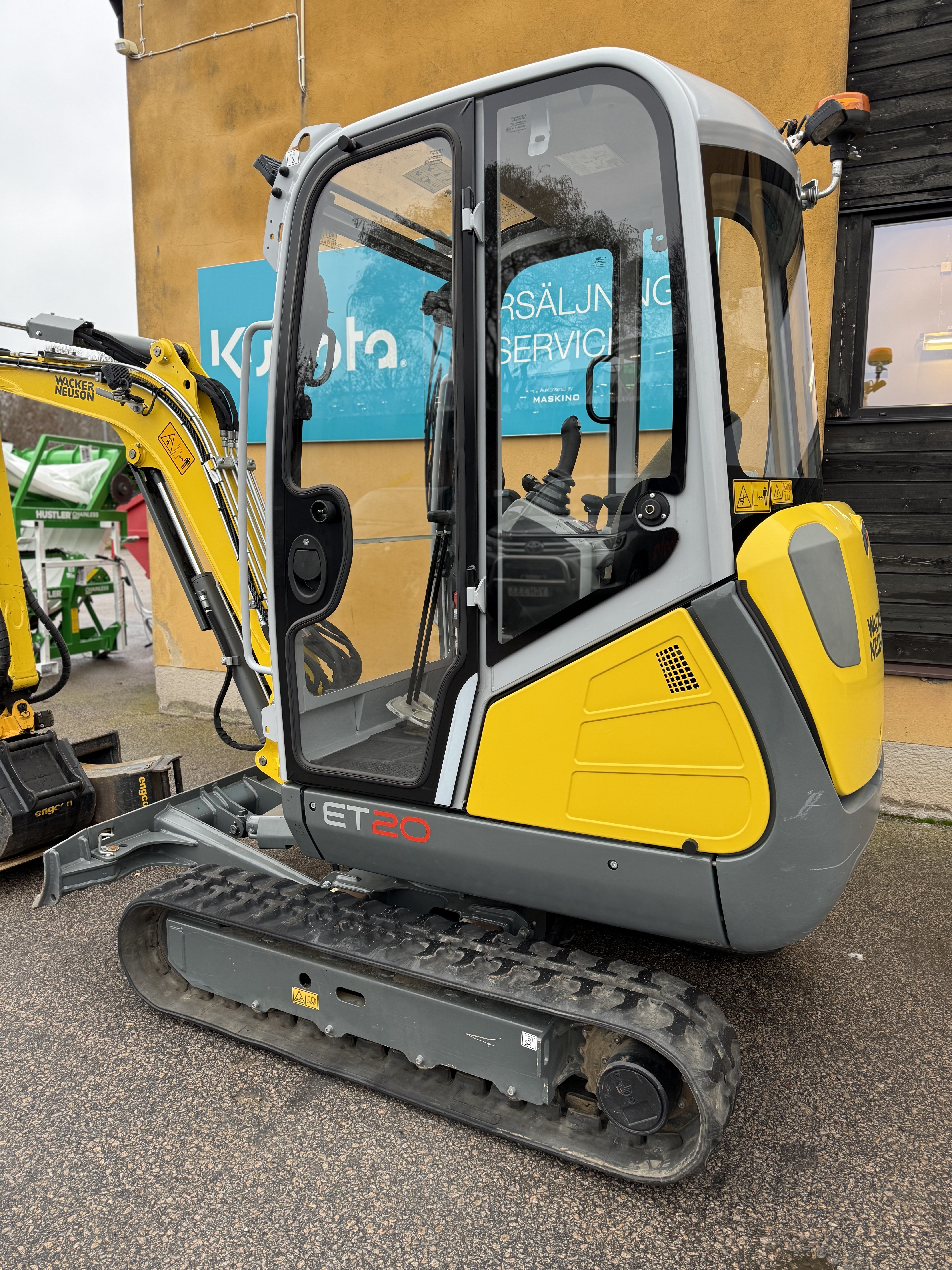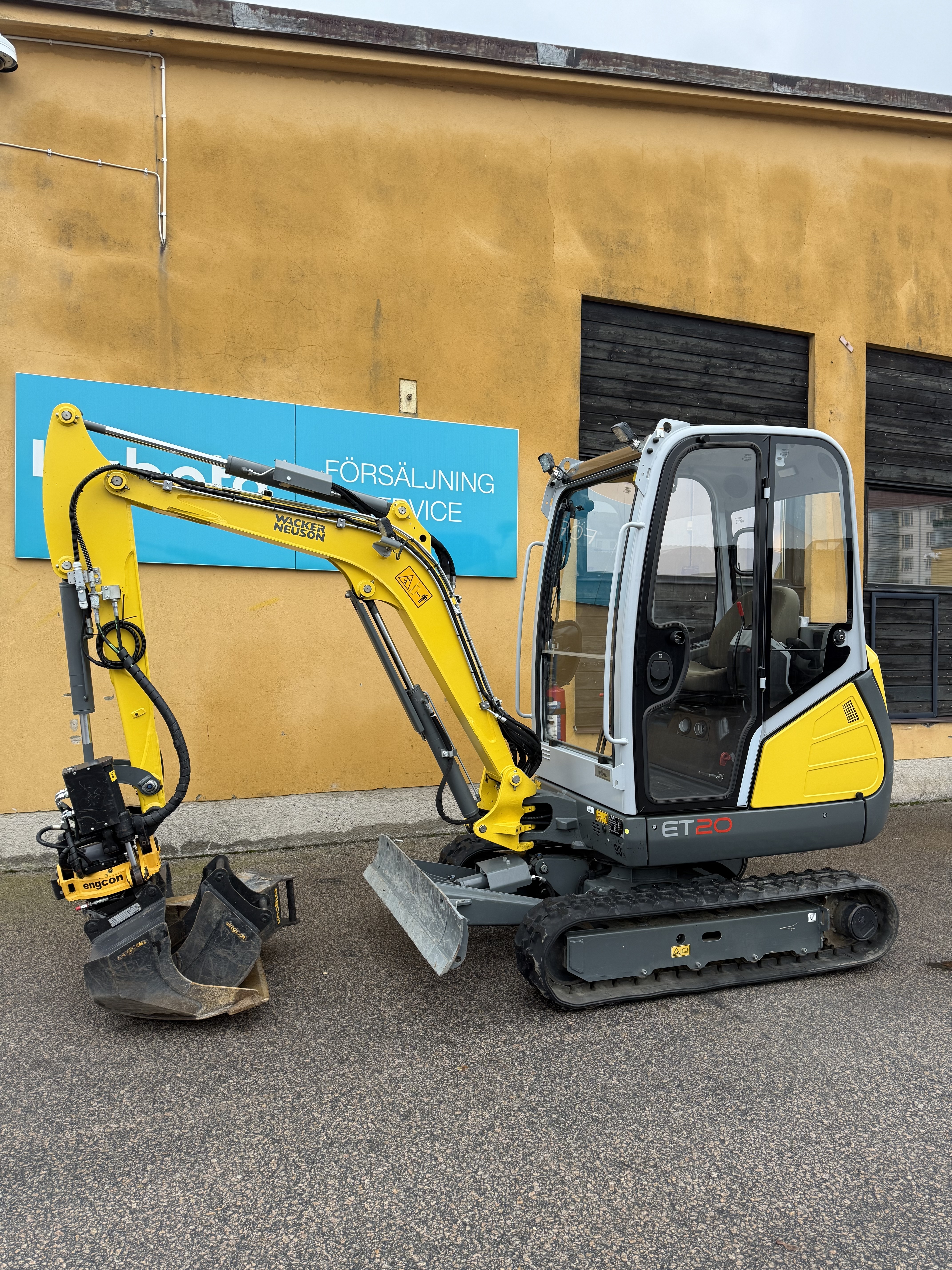 WACKER NEUSON ET20 Maskinvikt: 2155kg 2022 765 h engcon Ec02 S30/180 SS9 (4 slang) direktinfäst. Breddbar undervagn 990 mm – 1300 mm 3-cyl Yanmar-motor Automatgas 4 st arbetsljus LED 3 st skopor (engcon) Mycket välhållen maskin!